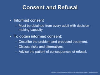 In this case the victim must be able to understand the situation and communicate clearly in order to provide expressed consent. In some medical situations your consent to a treatment or a procedure is implied. Explain what first aiders need to understand about legal issues.